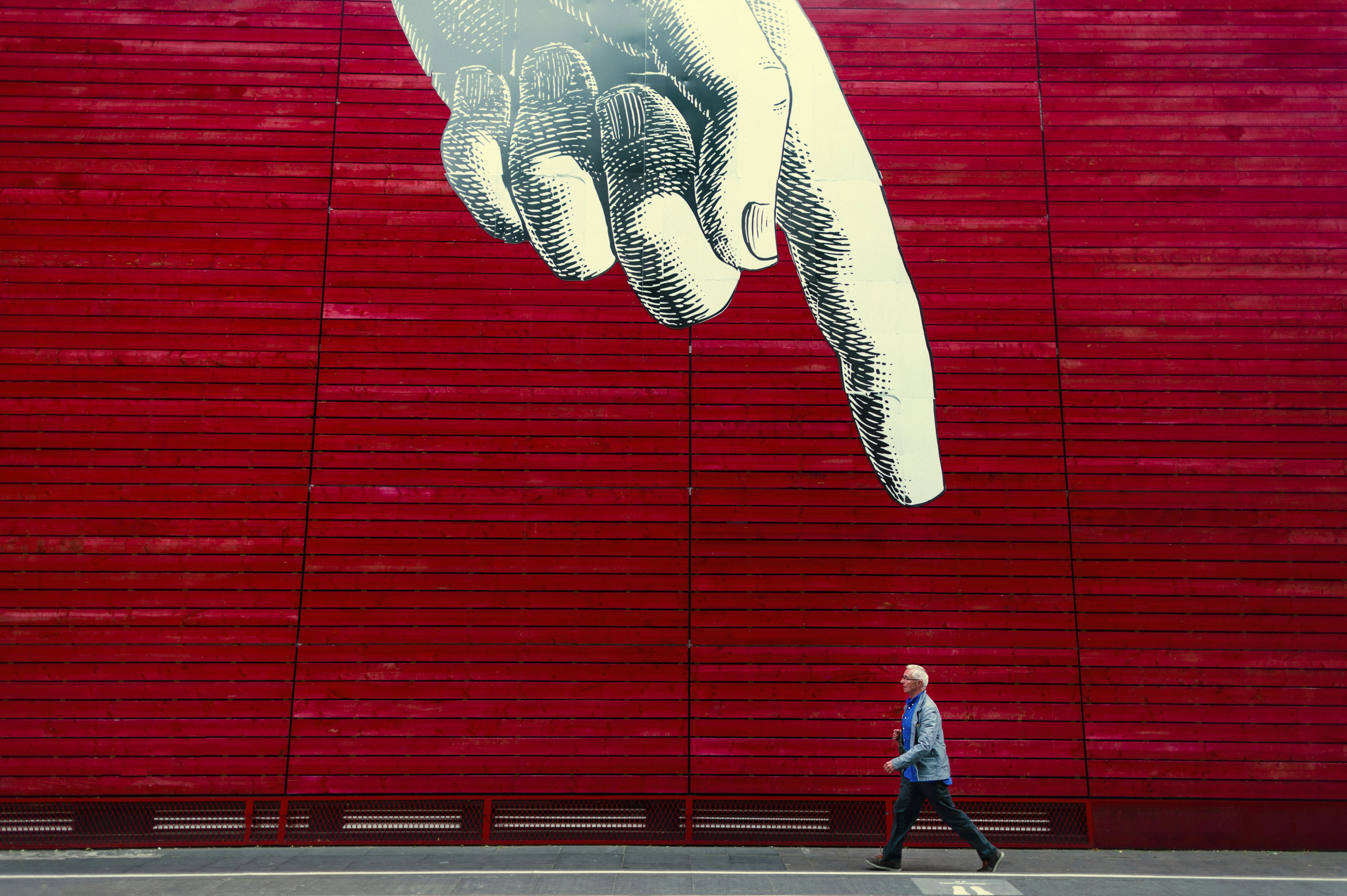 A person walking by a wall painting of a realistic hand with its index finger pointing down.