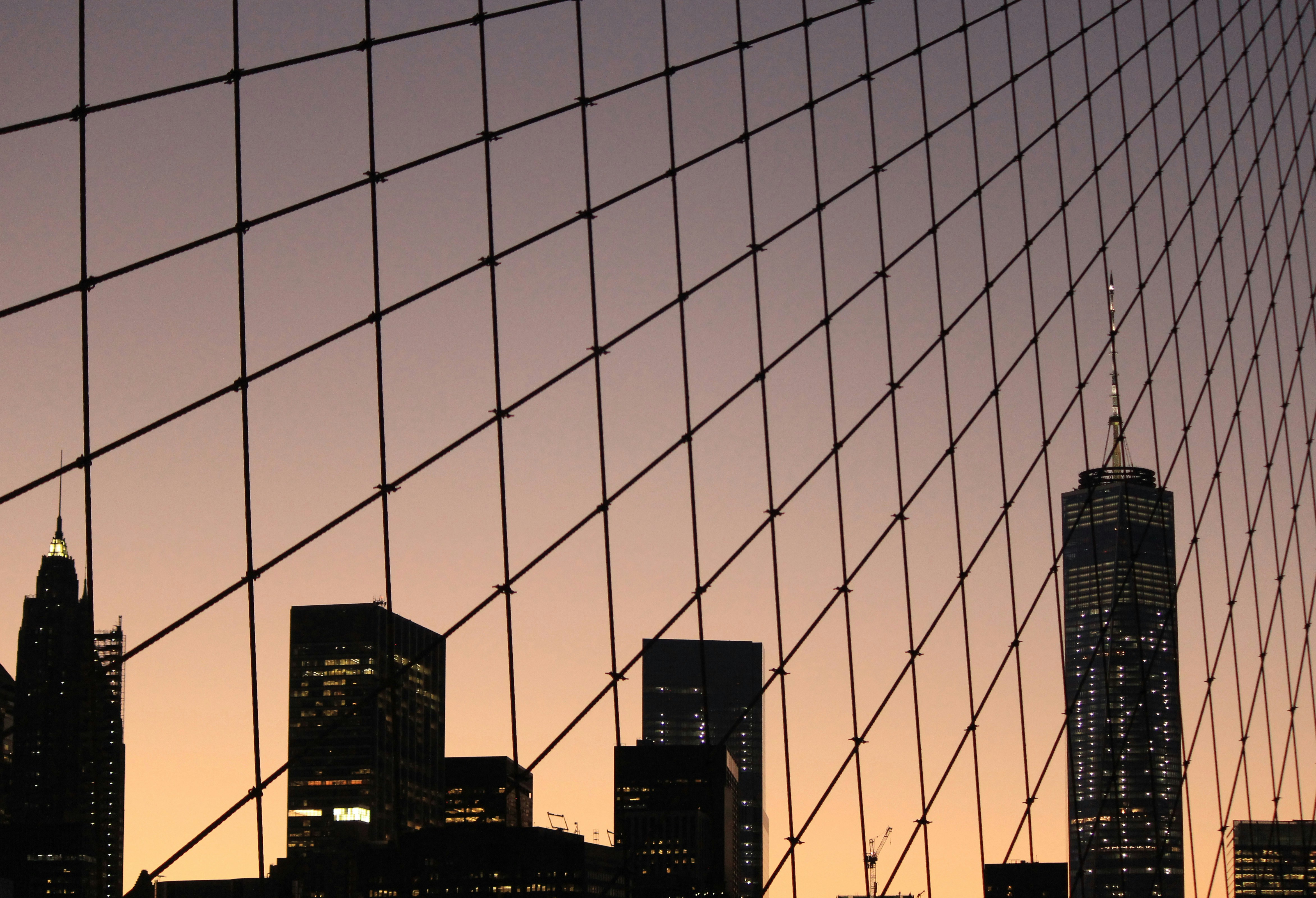Looking up at the New York City skyline through a chain link fence at sunset