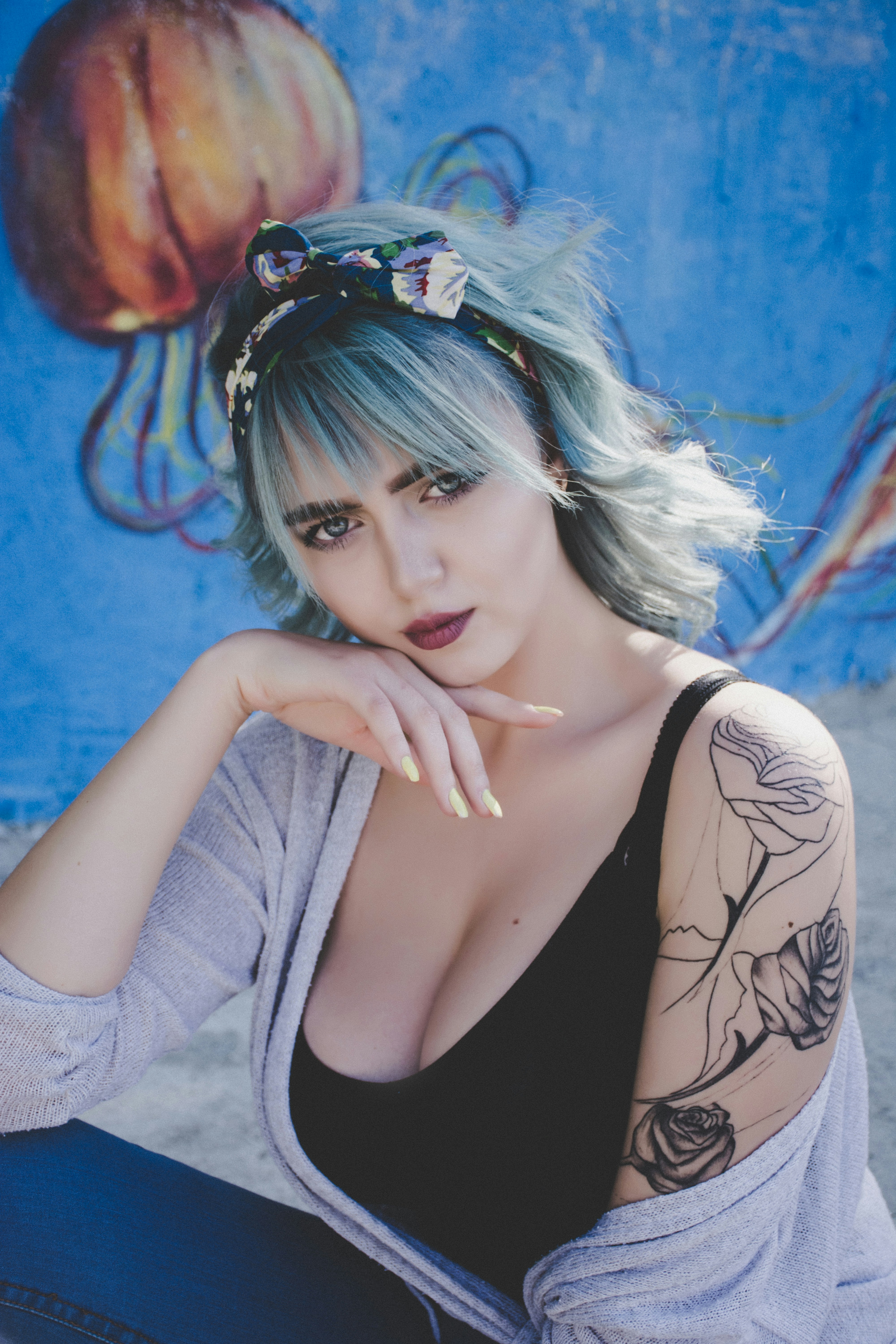 woman in gray cardigan seating