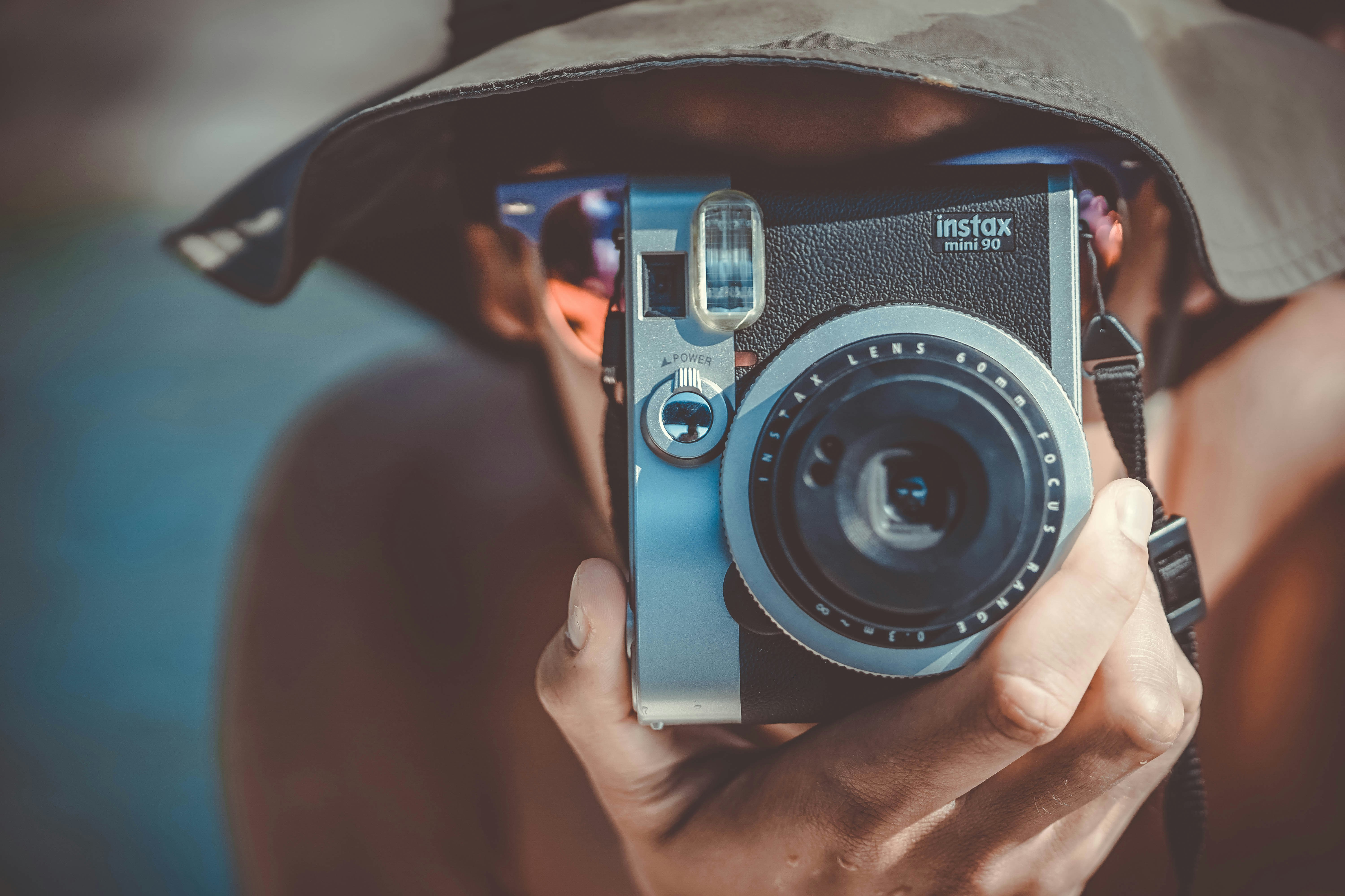 person with brown bucket hat using black and grey Fujifilm Instax camera