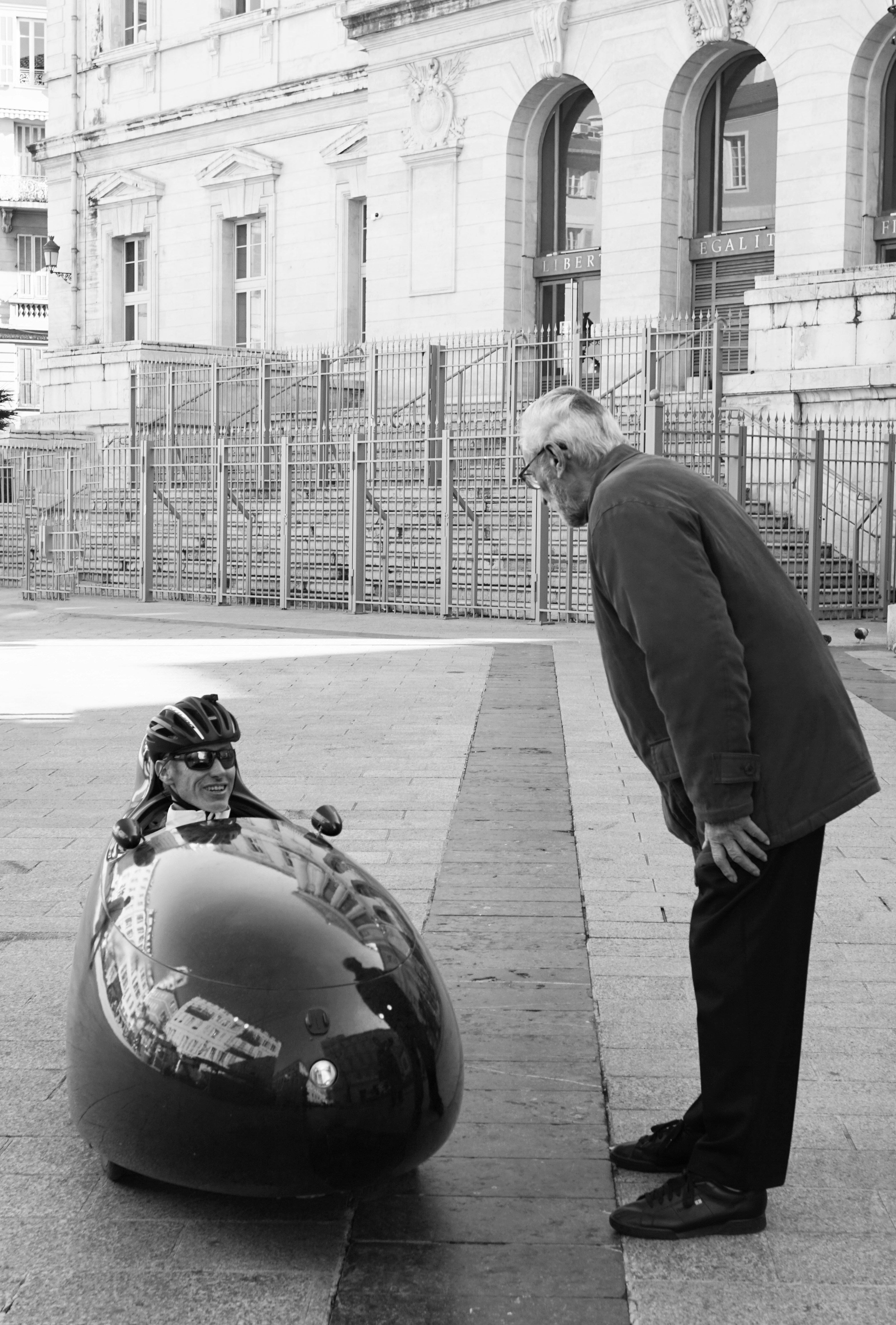 greyscale photography of man standing beside man sitting on mobile