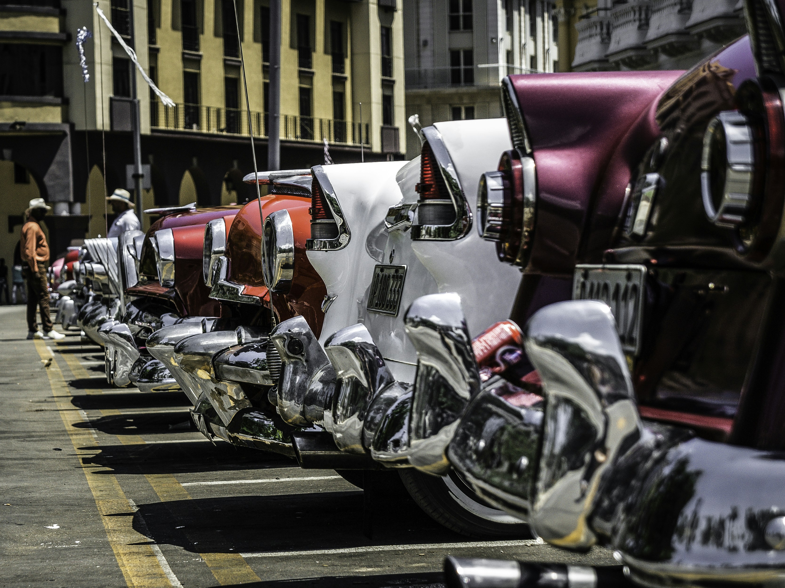 lined white, purple, and red vehicles