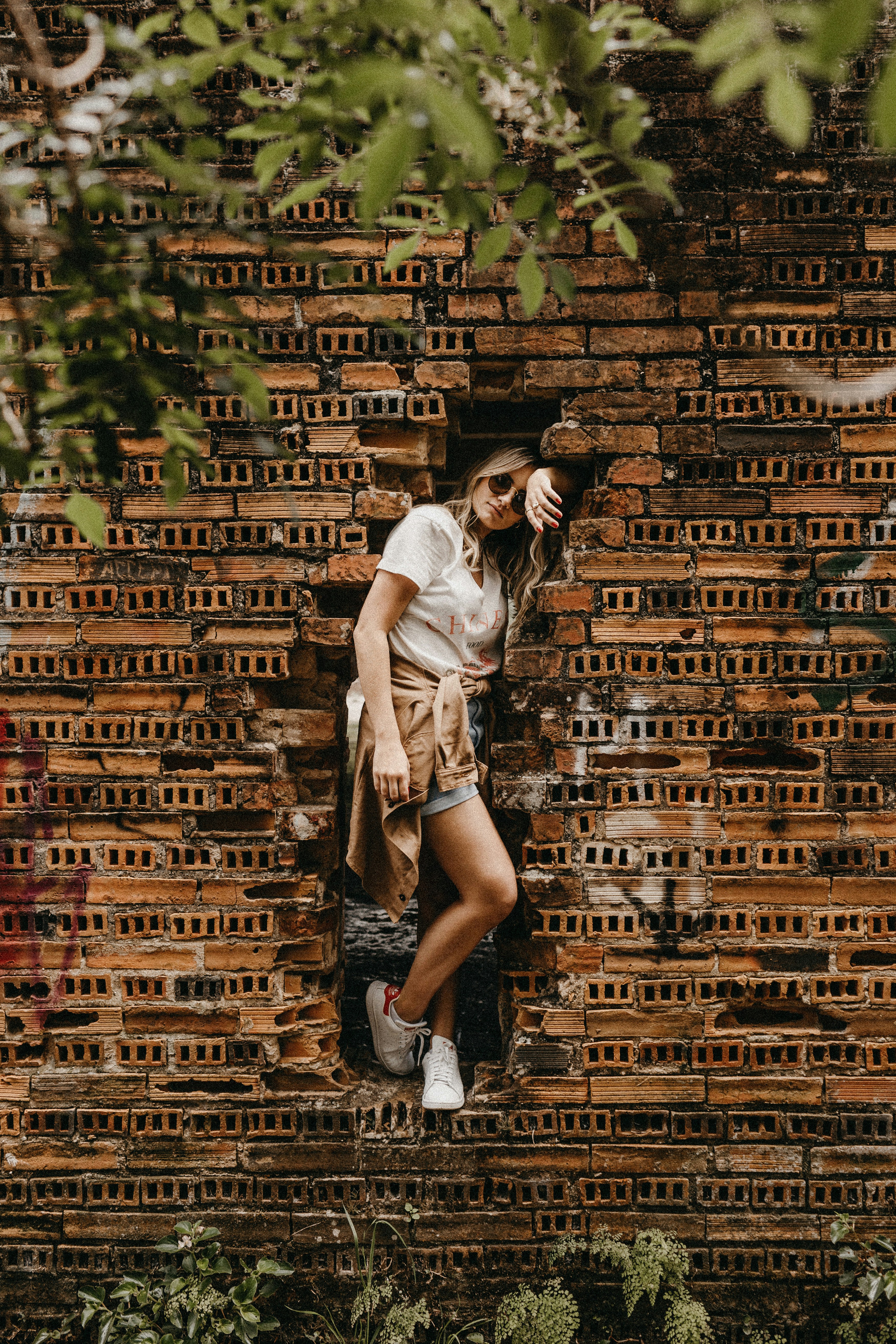 woman leaning on concrete bricks