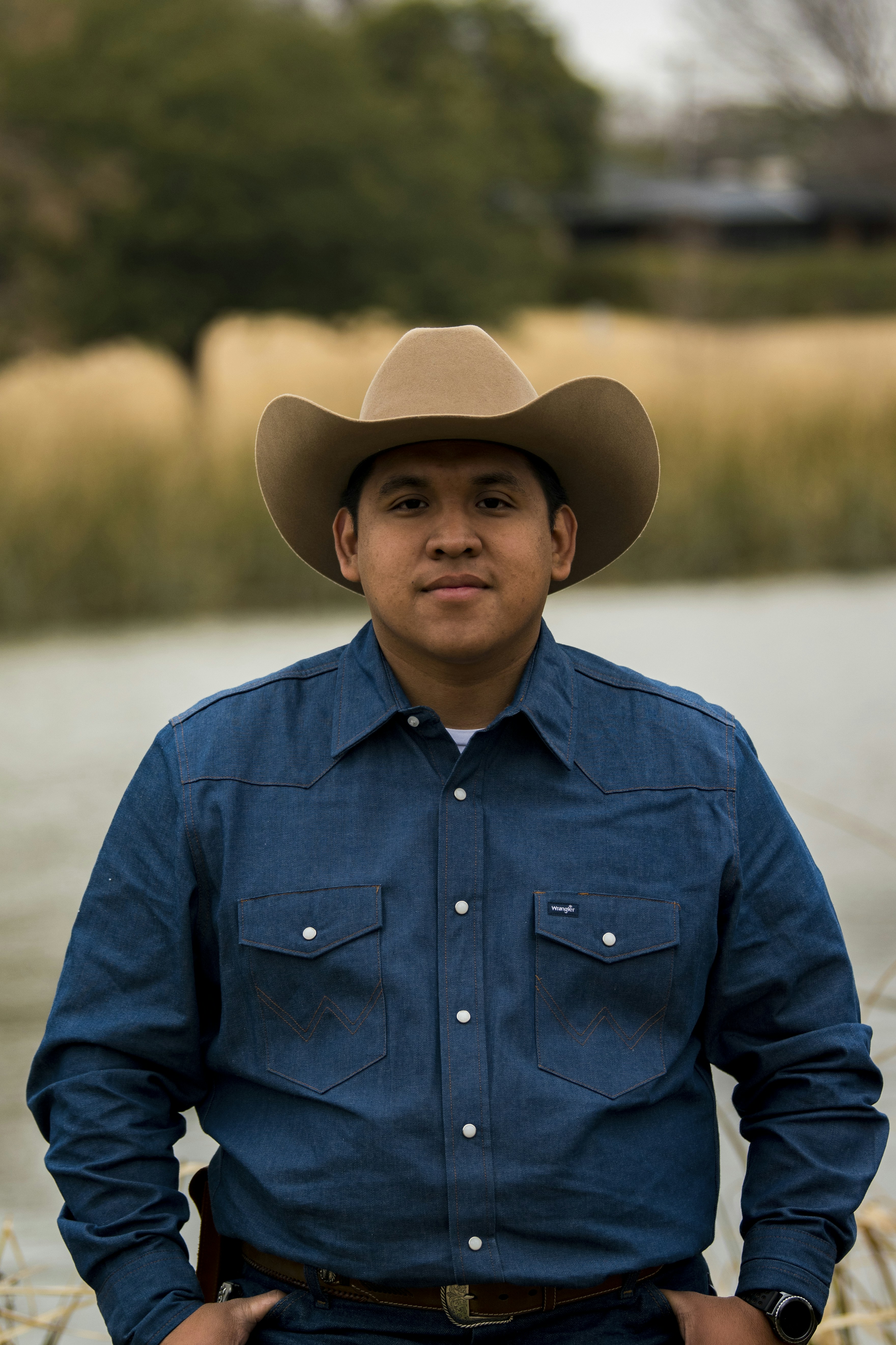 man in blue dress shirt wearing brown fedora hat